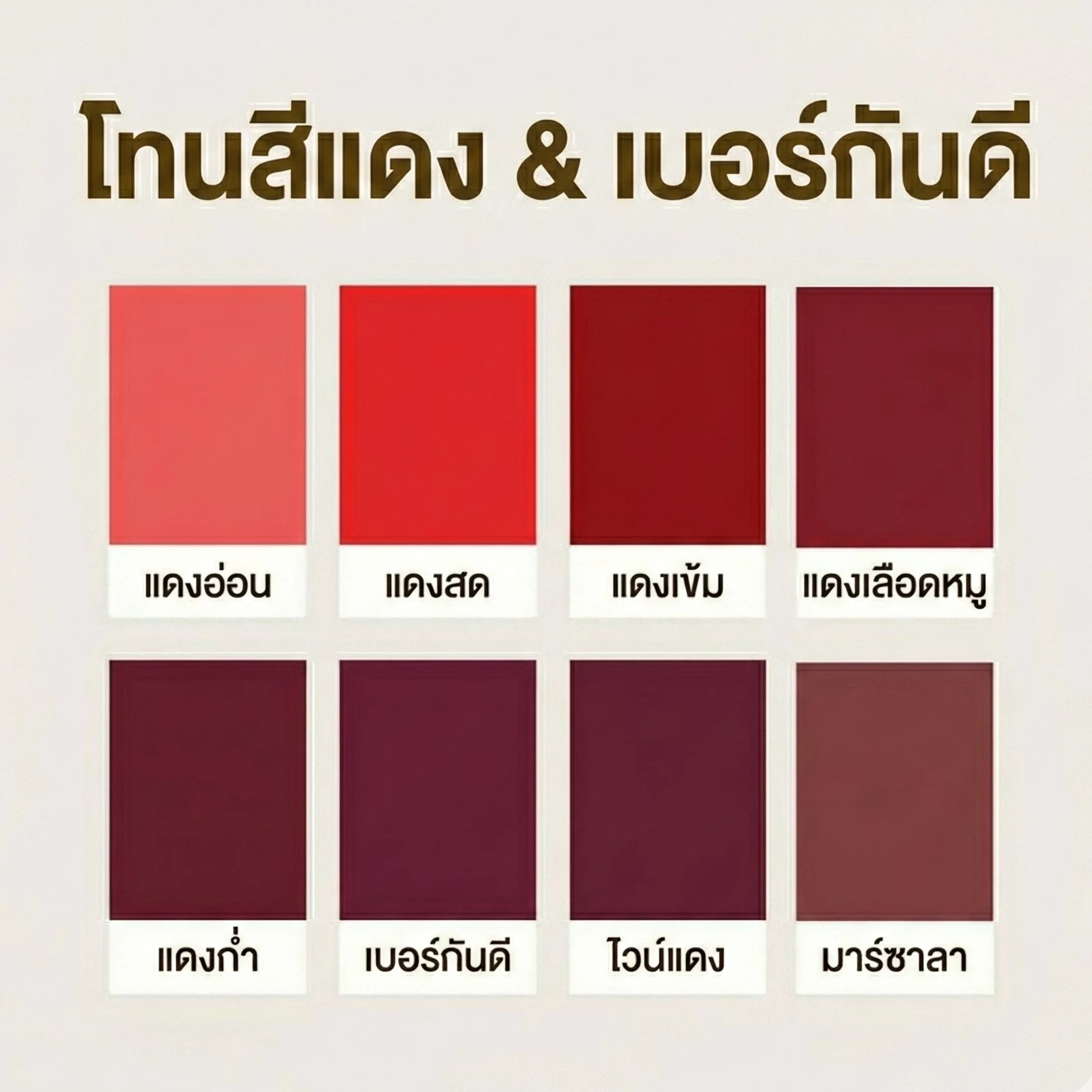 สีแดงเป็นสีของพลัง ความโชคดี และการเริ่มต้นใหม่ ส่วนสีเบอร์กันดีจะให้ฟีลที่ลึก สุขุม และหรูขึ้น เหมาะกับช่วงปลายปีที่ต้องการความโดดเด่นและสร้างแรงจดจำ อย่างไรก็ตาม สีในกลุ่มนี้ควรใช้อย่างมีกลยุทธ์